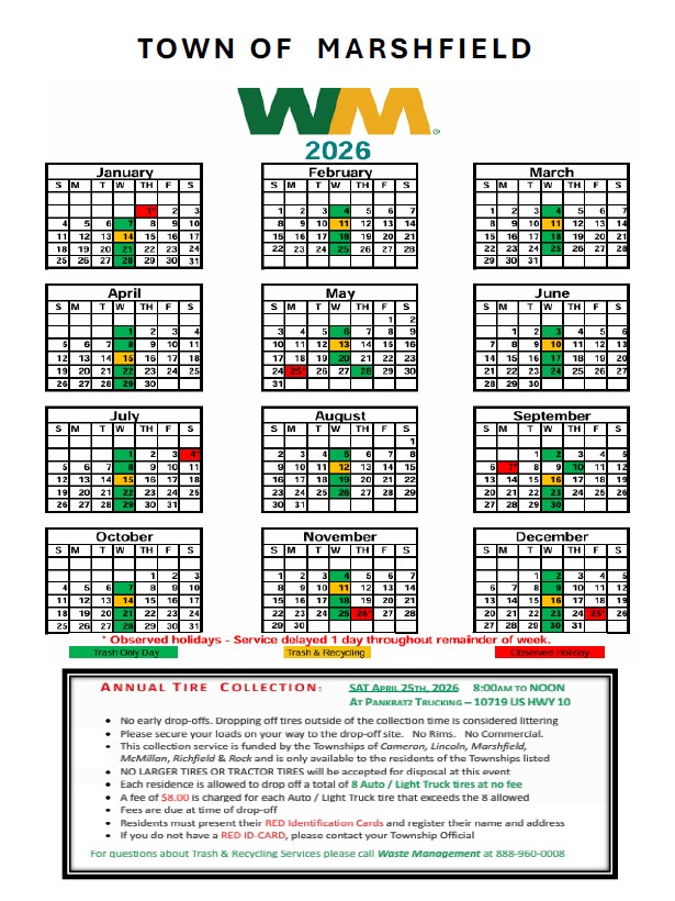 The Township of Marshfield contracts Waste Management for trash and recycling services. They can be contacted at 1-888-960-0008. The standard schedule for trash pickup is every Wednesday of the month, and the standard schedule for recycling pick up is the second Wednesday of the month. Please note Federally Observed Holidays impact this standard schedule.